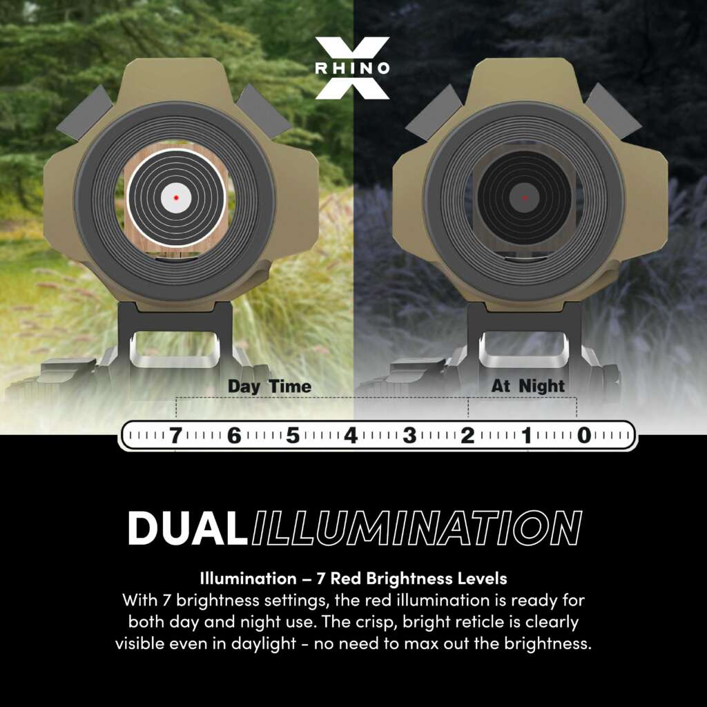 With 7 brightness levels, dual reticle patterns, and fingertip windage and elevation adjustments, the Rhino adapts quickly to changing environments. Tough, versatile, and dependable — it’s the optic you can count on when the pressure’s on.